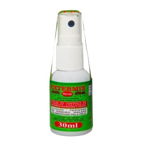 Extermix spray 30ml, inseticida utilizado para eliminar com facilidade e sem a necessidade de mão de obra especializada, formigas e cupins em móveis, jardins, plantas, arvores e telhados, entre outros.
